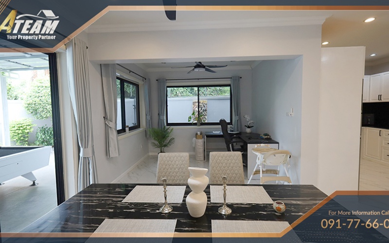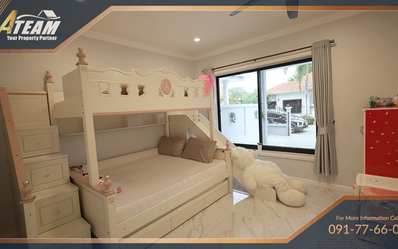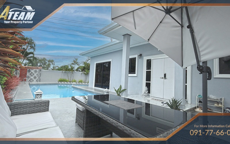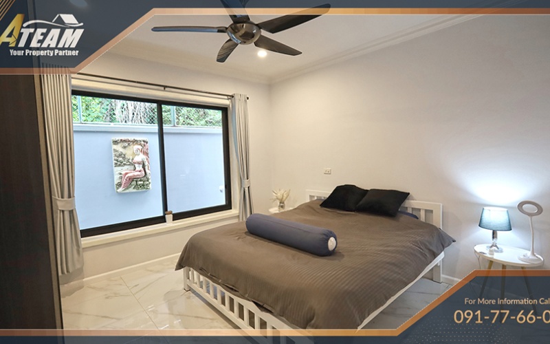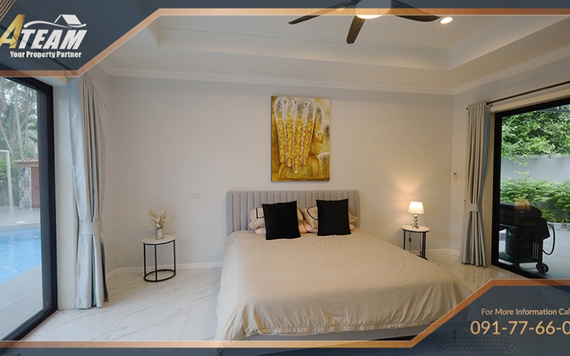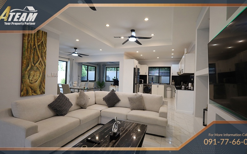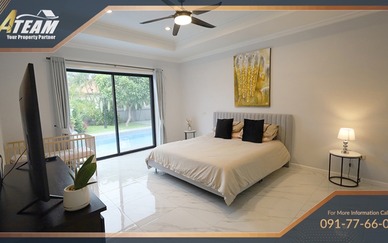 The property features a large private swimming pool with jacuzzi, spacious interiors, and comfortable living areas ideal for both long-term residents and seasonal renters. The villa combines privacy and convenience, with easy access to shopping centers, restaurants, schools, and Hua Hin’s city center.